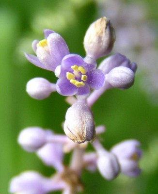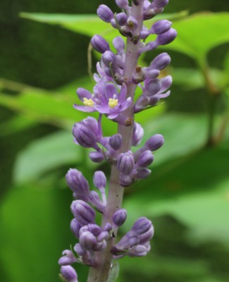 ・花茎は高さ30〜50cm直立し、先端に長さ8〜12cmの花序をつけ、淡紫色の花を数個ずつ束生する。花被片は長さ約4mmで6個ある。