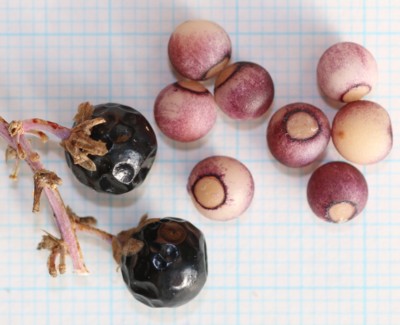 ・種子は直径6〜8mmの球形で、熟すと光沢のある黒色になる。