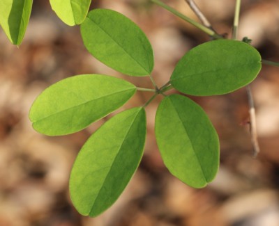 ・葉は互生。掌状複葉。小葉は5個あり、長さ3〜10cm、幅1〜2cmの長楕円状倒卵形。