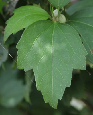 ・葉は互生、長さ4〜10cm、幅2.5〜5cmの卵形〜菱形状卵形で、3本の脈が目立つ。ふちには不揃いの粗い鋸歯があり、浅く3裂するものもある。