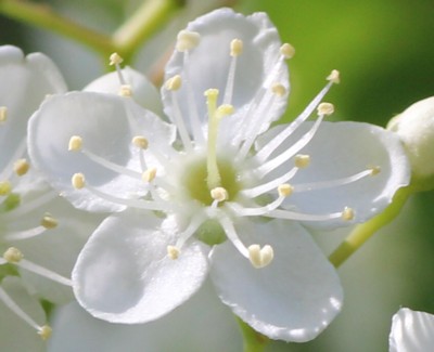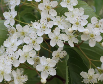 ・枝先に複散房花序を出し、白色の花を十数個つける。