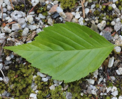 ・葉は互生。長さ5〜10cm、幅3〜7cmの卵形〜楕円形で、縁に浅い重鋸歯がある。