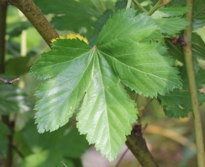 ・葉は長さ、幅とも6〜12cmの広卵形で、掌状に3〜7中裂する。