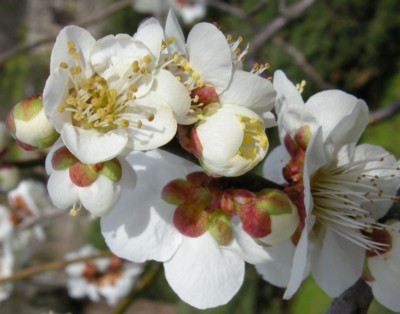 ・花は直径2〜3cm。普通、花弁は5個で色は白色だが、品種によっては、淡紅色〜紅色、八重咲きのものもある。