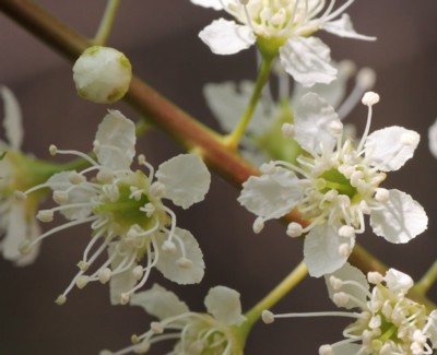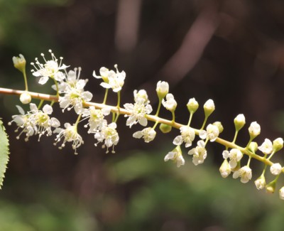 ・長さ8〜15cmの総状花序を出し、白色の花を多数つける。花は直径約6mm、花弁は5個で長さ約3mmの倒卵形。