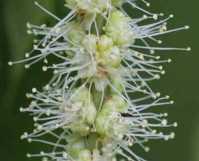 | ・雄花は無柄で半円形の苞のわきに7個ほどが集まってつく。雄しべは約10個、花被の外にとびでる。 |