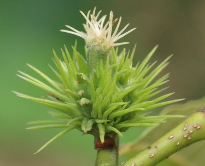 | ・雌花は緑色の総苞(若いイガ)の中に3個ずつ入っている。花柱は針状で9〜10個ある。 |