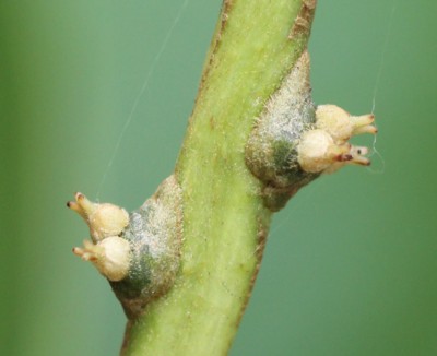 | ・雌花は直径1cmほどの総苞に包まれる。花柱は円柱形で3個。 |