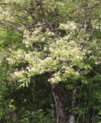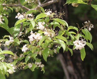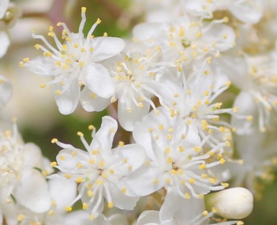 | ・枝先に円錐花序を出し、直径約8mmで白色の花をつける。花冠は5深裂し、雄しべは多数ある。 |