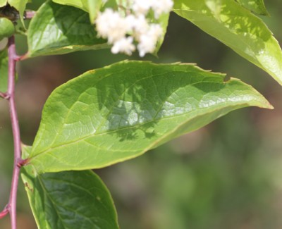 ・葉は互生。長さ3〜10cm、幅2〜4cmの長楕円形。先端は短くとがり、ふちには微細な鋭鋸歯がある。
