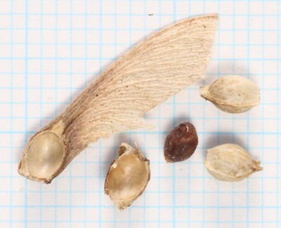 ・果実は翼果。分果は長さ約1.5cmで無毛。翼はほぼ水平に開く。