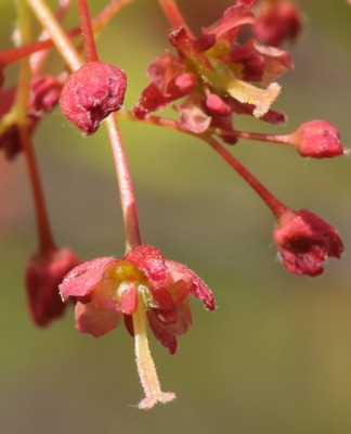 ・花は直径約5mm、複散房花序に10〜20個つけ、雄花と両性花が混生する。