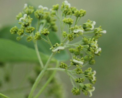 | ・花は淡黄色で、長さ2〜3cmの散房花序に20個ほどつける。ひとつの花序には雄花と両性花が混生する。 |
