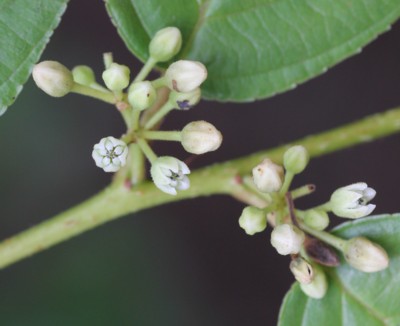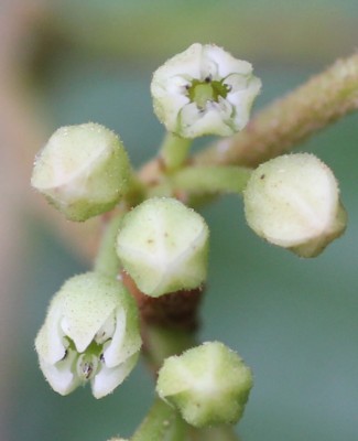 ・花は両性。枝の上部の葉腋に集散花序を出し、黄緑色で直径約5mmの花をつける。花弁と萼片は5個ある。
