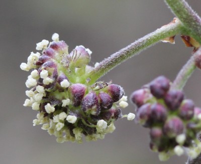 | ・雌花序は直径約5mmの球形で、花柱は赤紫色。 |