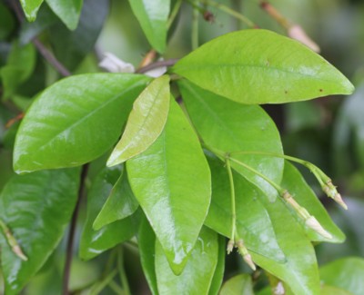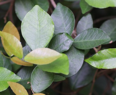 ・葉は対生。長さ3〜7cm、幅1.5〜2.5cmの楕円形で全縁。林床を這うつるの葉は長さ1〜2cmと小形で、波状の浅い鋸歯がある。