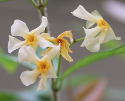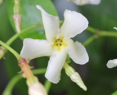 ・枝先や葉腋に集散花序を出し、白色の花をつける。花冠は直径2〜3cm、5裂し裂片はねじれる。