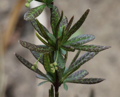 ・葉は互生。長さ3〜9cm、幅1〜2cmの倒卵形〜倒披針形。