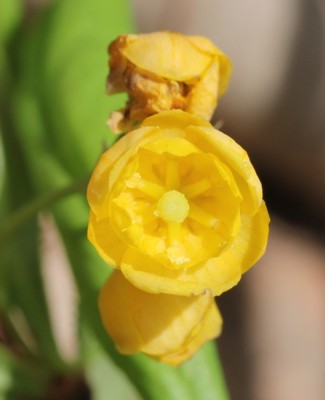 ・枝先から総状花序をだし、黄色い花を数個垂れ下がってつける。花は直径約6mm、花弁と萼片はともに6個。