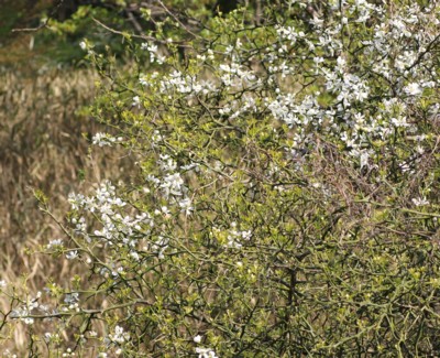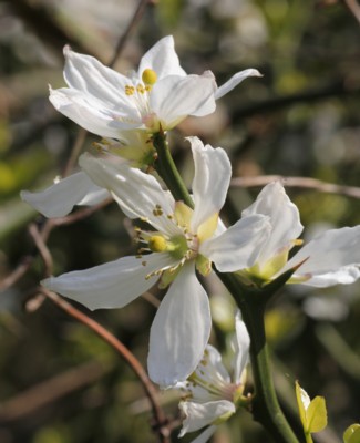 ・花は葉が展開する前に咲く。白色で直径3.5〜5cm、花弁は5個。