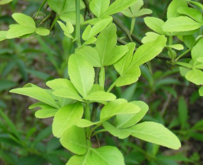 ・葉は互生。3出複葉で葉柄には翼がある。小葉は長さ3〜6cm、幅1〜2cmの倒卵形または長楕円形。