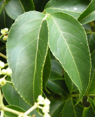 ・葉は対生。長さ10〜30cmの奇数羽状複葉で2〜5対の小葉がある。小葉は長さ5〜9cm、幅2〜5cmの狭卵形で先は尖り、ふちには芒状の鋸歯がある。