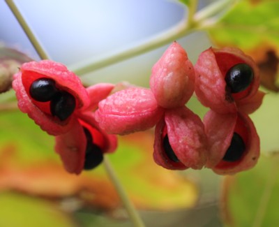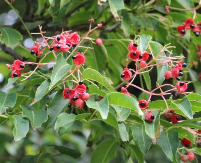 | ・果実は袋果。長さ1cmほどの半月形。9〜11月に赤く熟し、裂開して種子が1〜2個顔を出す。 |