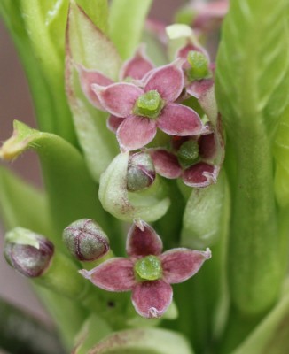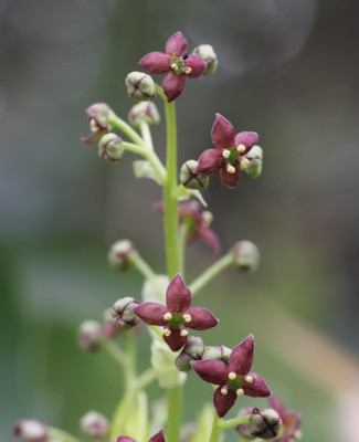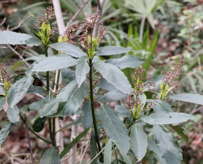 ・前年枝の先に円錐花序を出し、直径1cmほどの紫色の花をつける。花弁は長卵形で4個ある。