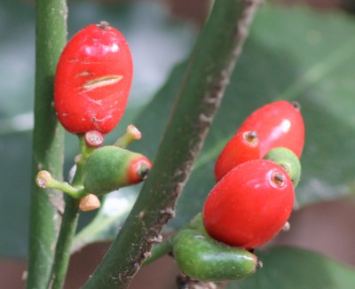 | ・果実は長さ1.5〜2cmの長楕円形で12〜5月に赤く熟す。 |