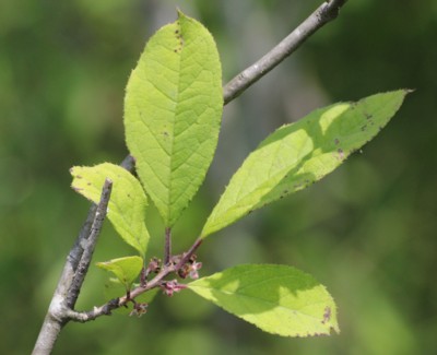 ・葉は互生。長さ3〜8cm、幅1.5〜3cmの楕円形または卵状長楕円形。先端はとがり、縁には細かい鋭い鋸歯がある。