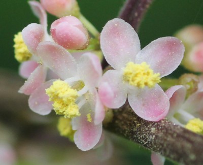 ・花は直径3〜4mmの淡紫色。雄花序には5〜20個、雌花序には2〜4個を本年枝の葉腋につける。
