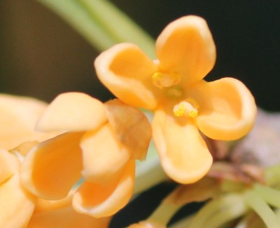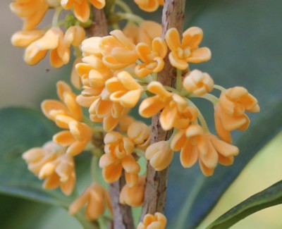 ・葉腋に集散花序をつけ、橙黄色で芳香のある花を多数つける。