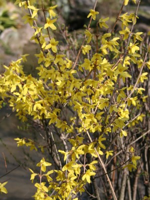 ・花は鮮黄色で直径約2.5cm、葉の展開前に開花する。花冠は4深裂し、裂片の幅は7〜10mm。
