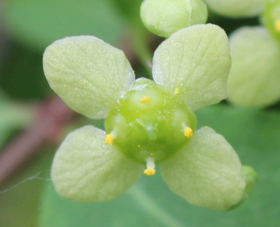・花は淡緑色で、直径6〜8mm。花弁は4個、雄しべは4個、雌しべは1個。