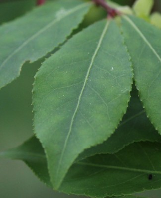 ・葉は対生。長さ2〜7cm、幅1〜3cmの長楕円形または倒卵形。先は鋭くとがり、ふちには細かく鋭い鋸歯がある。