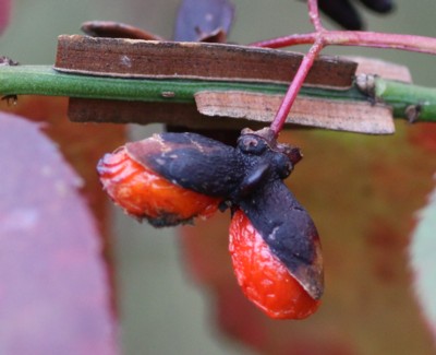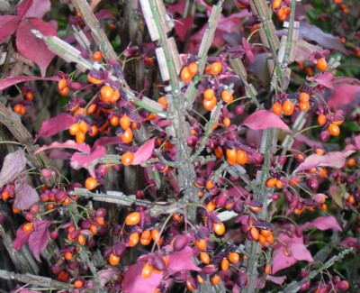 | ・10〜11月に熟すと、裂開して橙赤色の仮種皮に包まれた種子を出す。 |