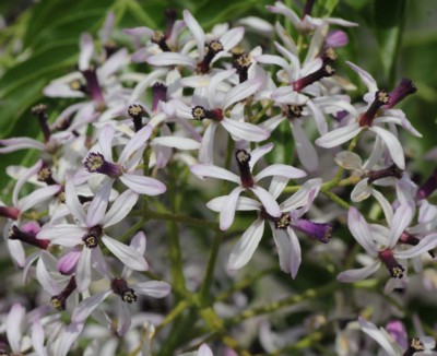 ・本年枝の基部の葉腋から集散花序を出し、淡紫色の花を多数つける。