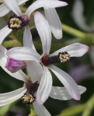| ・花弁は5個、長さ8〜10mmの倒披針形。雄しべは10個、紫色の花糸が合着して雄しべ筒をつくる。雌しべは1個。 |