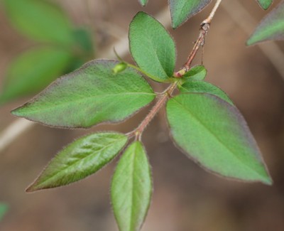 ・葉は対生。長さ3〜6cm、幅2〜4cmの広楕円形〜倒卵形。表面には不明瞭な腺点と毛、裏面には毛がある。