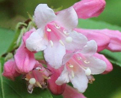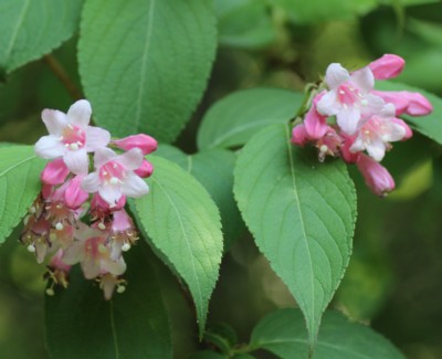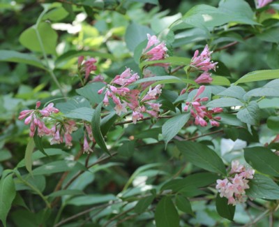 ・花は淡紅色〜紅色で、枝先や葉腋に2〜3個ずつつける。