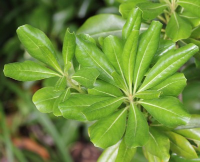 ・葉は互生。長さ5〜10cm、幅2〜3cmの倒卵形または長倒卵形で、枝先に輪生状に集まってつける。先はまるく、ふちは全縁で、しばしば裏側に巻く。