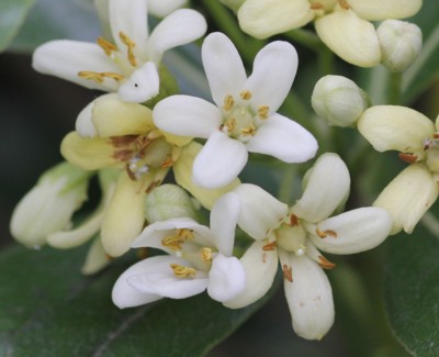 ・雌雄異株。本年枝の先に集散花序をだし、直径2cmほどの白い花を多数つける。