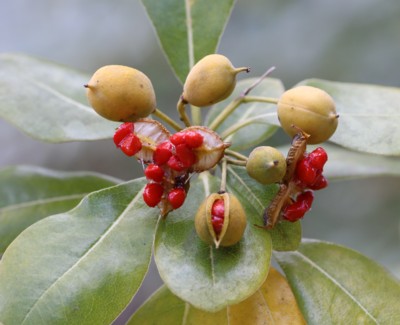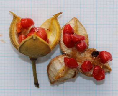 | ・果実は刮ハで、直径1〜1.5cmの球形。11〜12月に熟すと、3裂して種子を出す。 |