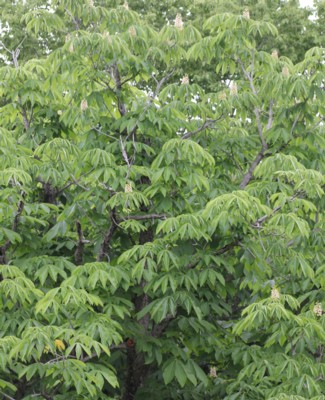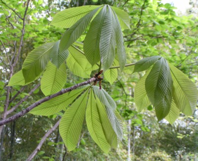 ・葉は対生。掌状複葉で葉柄は長さ5〜25cm、小葉は長さ13〜30cm、幅4.5〜12cmで5〜9個ある。