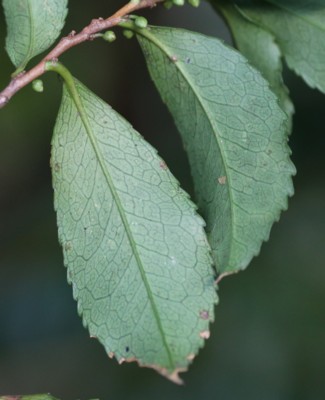 ・葉は互生。長さ3〜7cm、幅1.5〜3cmの楕円形〜倒披針形。ふちには浅い鋸歯がある。表面は光沢があり、裏面は淡緑色、両面ともに無毛。