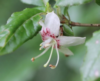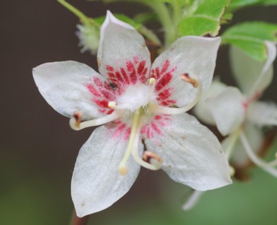 ・花は白色で中心部に紅紫色の斑点があり、直径約2cmの皿形で5裂する。