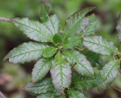 ・葉は互生、枝先に集まってつける。長さ3〜7cm、幅1.5〜2.5cmの楕円形〜狭楕円形。
