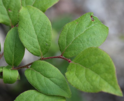 ・葉は互生。長さ3〜8cm、幅2〜4cmの楕円形または広卵形。ふちは全縁、表面やふちに粗い毛が生える。