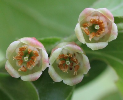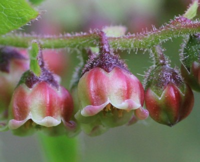 ・枝先から総状花序を出し、赤みを帯びた淡黄緑色の花を多数つける。