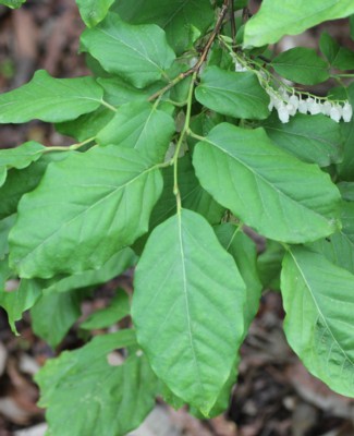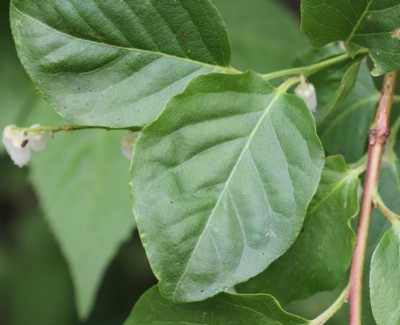 ・葉は互生。長さ5〜10cm、幅2〜6cmの広卵形または卵状楕円形。先端はとがり、ふちは全縁。